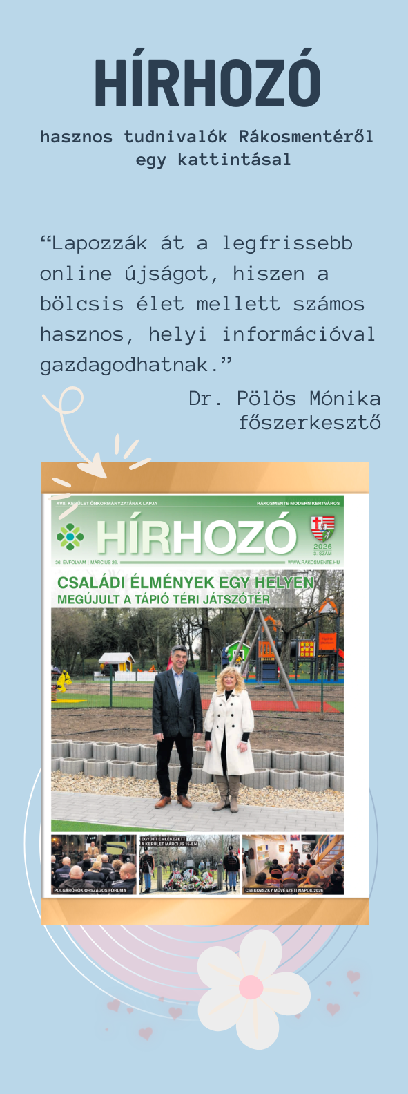 2026. április 27-e és 30-a között bölcsődéink, nyílt napokon várják szeretettel 9-11 óráig. Néhány fős csoportokban, munkatársaink végigvezetik az érdeklődőket az épületen és a játszókerteken, így bepillantást nyerhetnek a bölcsődei életbe. Az...